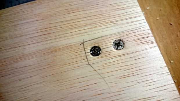 2) usando sus tornillos de cabeza avellanada 2, coloque en su marca y atornillarlas hasta que se vuelcan a la base. No apriete demasiado ya que pueden dañar la madera.