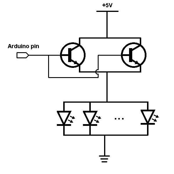 La solución habitual a la necesidad actual de salida más es utilizar los pines de Arduino para encender/apagar un transistor, pero en este caso estaba un poco dudosa sobre que. Busqué las especificaciones del transistor 2N222A que vino con mi kit de ARD-X y que sólo pueden manejar 500mA cada una, así que incluso uno de esos puede sobrecargar conduce estos LEDs. Afortunadamente, el kit de vino con tres de ellos así que poner dos en paralelo a la mitad de la corriente que cada uno se cambio.