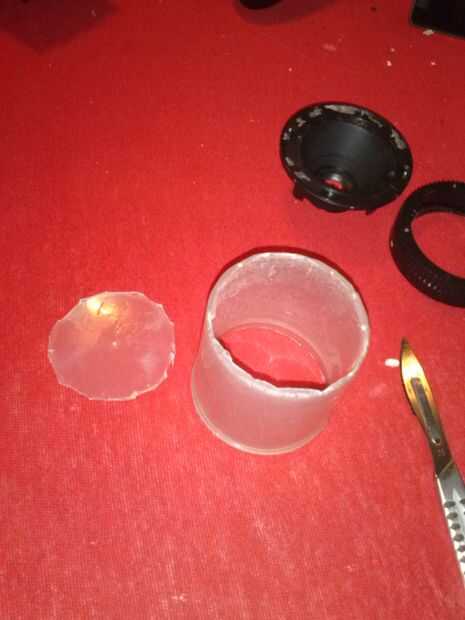 No podría caber en el primer intento, así que lo que hice, calentado los bordes de esta caja con un mechero y cuando estaba todavía caliente, apreté la lente. Sólo no fundirlo, que sería un fastidio!
