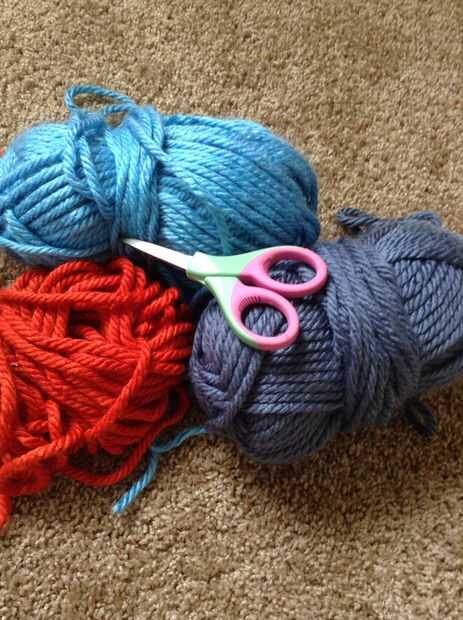 Necesita reunir tres colores de hilo/cuerda. Elegí azul, gris y rojo-naranja. Usted también necesitará tijeras de artesanía.