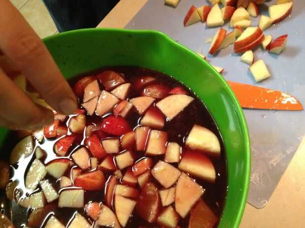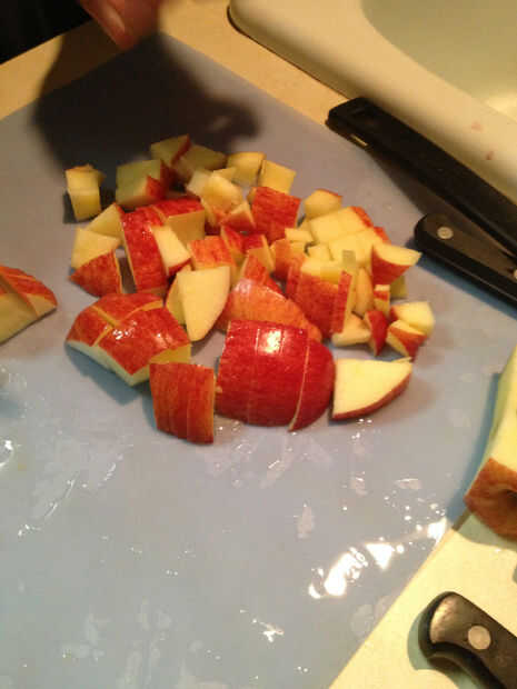 • Una vez que las manzanas se cortan tomar y cortar las rodajas de manzanas ya cortadas
