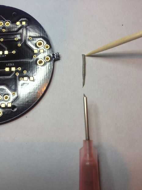 Para el método de hisopo palillo y algodón, su objetivo es dab pequeñas cantidades de pasta en cada pad con el palillo de dientes. La pasta no es necesario cubrir el colchón, sólo es necesario que haya suficiente para sujetar firmemente el componente y hacer un buen filete entre el tablero y el componente después de que el proceso de soldadura. No te preocupes demasiado por la exactitud o pulcritud aquí como goma de la soldadura es bastante indulgente. Si la soldadura viene en una jeringa como mina puede encontrar más fácil sacar un poco de soldadura sobre un pedazo de papel y manipular con el palillo. Encontré la soldadura de la aguja se coloca a menudo demasiado y terminó en regiones no deseadas. Si necesita quitar la pasta de soldadura por cualquier razón durante este proceso puede utilizar un hisopo de algodón para levantar suavemente la pasta no deseada fuera del tablero.