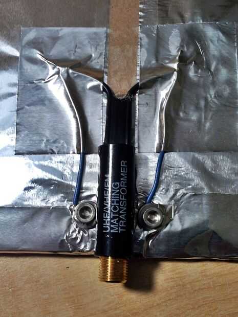 - Ahora tienes dos cables cortos cada papel de aluminio. Si nos fijamos en el transformador, hay dos cables y un conector hembra del cable de TV. Conecte estos cables a los cables que solo la antena de aluminio.