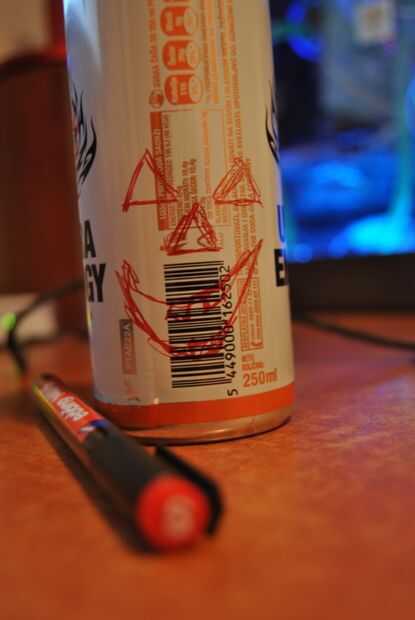 Lo primero que vas a hacer es dibujar un Jack-o-lantern en un bote con un marcador. Está en la posición que puso, así que no demasiado alto en la lata, o demasiado bajo...