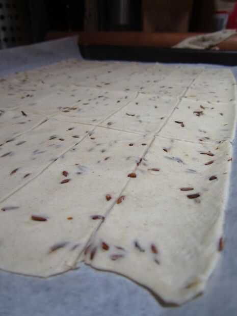 Utilice un cuchillo afilado de cuchillo o pizza para marcar la masa en galletas. Estos puede hacer cualquier forma que desee, pero generalmente mantenerlo simple y córtela en rectángulos pequeños.