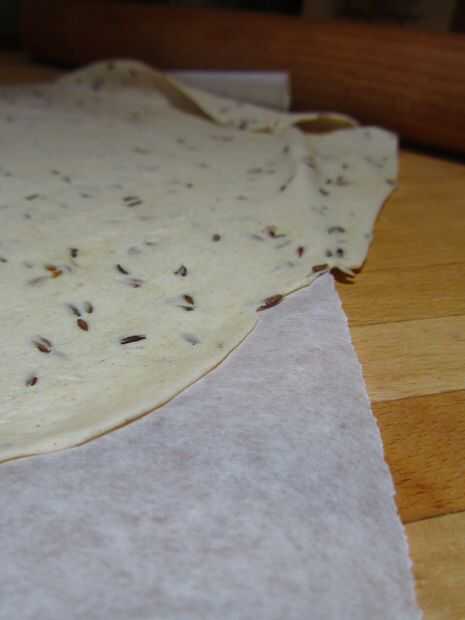 Estirar la masa tan fina como usted puede conseguir. Me parece la forma más sencilla de hacerlo es a rodar hacia fuera recto hacia el pergamino para hornear, a seguir adelante, rodar hacia fuera desde el centro. Una vez que una capa delgada que cubre el pergamino, recortar los bordes para hacer un rectángulo de masa y mueva el pergamino sobre la bandeja para hornear.