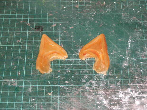 Suavemente comienzo a levantar un borde del látex. Tan pronto como empieza a levantar el cepillo algunos talco debajo de él. Continuar a cáscara y polvo hasta la oreja entera ha sido pelada. El polvo es importante porque si no tratada látex toca látex enlazará a sí mismo al instante y se arruinará la oreja. Uso un montón de polvo, no importa en absoluto.