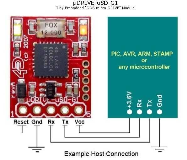 Conexión utiliza 5 cables: Gnd, Power, Tx, Rx y una línea de reset opcional. La línea de reset se puede dejar desconectada si no reinicio es necesario.