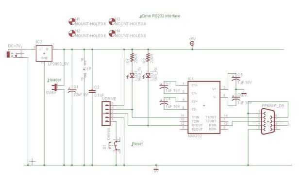 A los efectos de la prueba, hemos construido un poco uDrive convertidor RS232. Realmente se trata de volver a un PC vía puerto serie del PC (o a través de un USB al adaptador serial), que parece un poco inútil, pero al menos permite que el dispositivo a probar rápidamente y depura código.