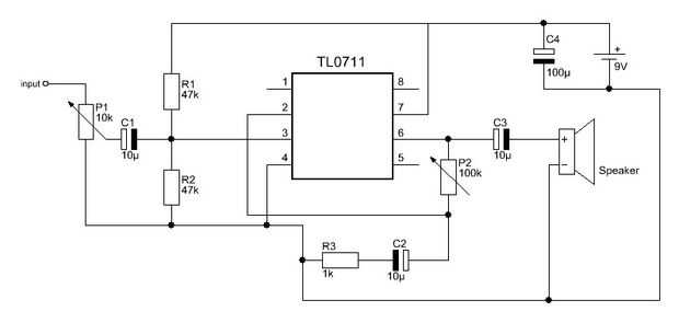 Trimmer P1 es para ajustar la potencia de entrada. P1 no es necesario. Condensador C1 es para el filtrado de corriente salida de señal de audio DC. Con resistencias R1 y R2 que divisor del voltaje. Con divisor de tensión fijamos el punto de trabajo del amplificador a la mitad de la tensión suministrada (4,5 V en este caso). Resistor R3 y trimmer P2 están allí para establecer la ganancia de los amplificadores. Condensador C3 es el condensador de salida y es para el filtrado de frecuencia de salida (corte bajo).
