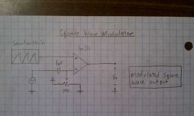 El circuito es bastante simple, tomar un comparador LM311 y alimentan la onda dientes de sierra en una señal de entrada y el AC con el offset de DC. El DC offset es establecido por el potenciómetro en el circuito modulador Unido. Usted puede jugar con esto pero 6V es acerca de donde debe ser (suponiendo que su suministro de carril es de 12V). La tapa del acoplador AC 1uF es absolutamente necesaria. El valor no es crítico, aunque recomiendo por encima de .1uF. También conviene no polarizado.