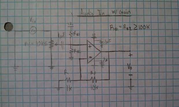 Si su fuente de audio es un reproductor de MP3, teléfono celular o similares; el segundo circuito, entrada de voltaje con ganancia, debe utilizarse. Los dos funciona, pero la tensión de estos dispositivos son generalmente pequeñas. Este circuito proporciona control de volumen con el potenciómetro y asegura que el dispositivo siempre ve por lo menos 10k para no cargar el dispositivo. El circuito que se muestra tiene una ganancia de 11, pero recomiendo jugando con este valor en función de su gusto. RB1 = RB2 para que la polarización de DC se centra. Puede utilizar un potenciómetro para esto con el fin de equilibrar las tensiones si desea. Utilice resistencias relativamente grandes para éstos. Si usted decide utilizar este circuito, debe eliminarse la CA acoplamiento condensador así como el pote de 10 k para que la salida del amplificador operacional se alimenta directamente en el comparador. El razonamiento es que la salida del amplificador operacional ya debe ser compensada por un valor de DC en la entrada de no inversión del op-amp. Me olvidé de escribir IC op-amp que usé en la foto. Te recomiendo un LF356 sin embargo un LM741 funcionan igualmente bien. Hay otras maneras de ir sobre esto pero esto es simple y eficaz.