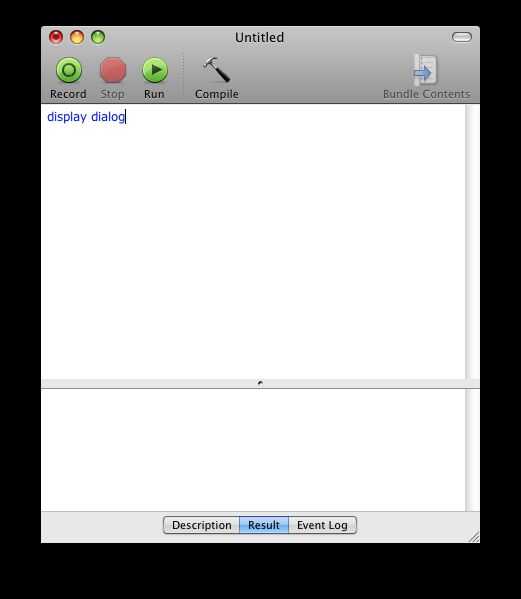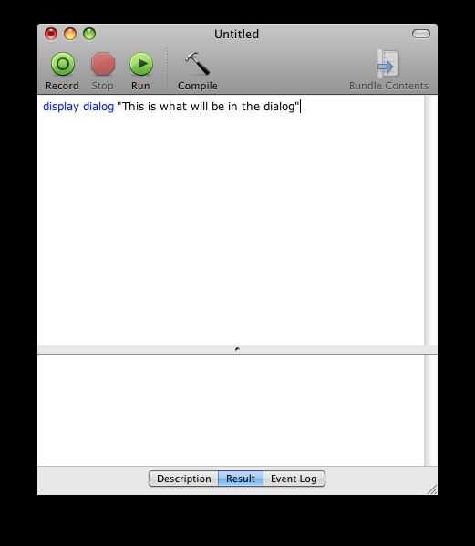 Fuego arriba Applescript y escriba lo siguiente en: -Mostrar el cuadro de diálogo (esto dice la computadora que va a hacer un cuadro de diálogo emergente) -"Texto va aquí" (cualquier cosa dentro de las comillas es lo que aparecerá en el cuadro de diálogo)