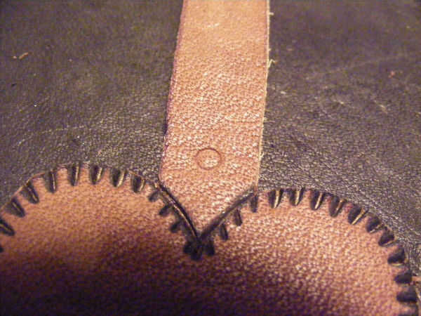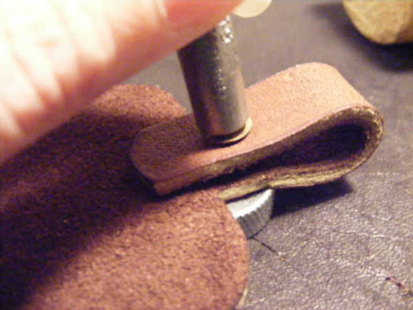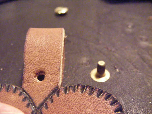 Doblar la solapa de cuero detrás y utilizando el primer agujero como guía, perfore un agujero en el otro lado.