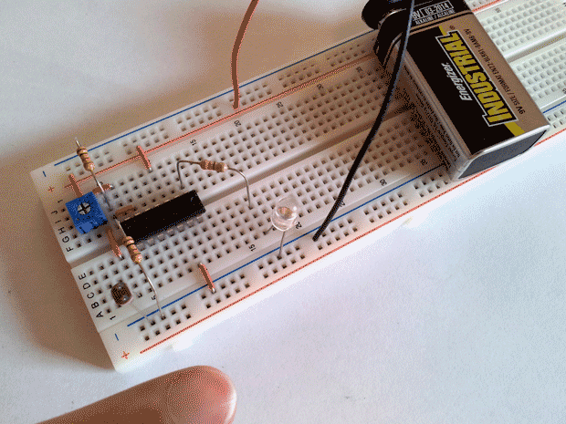 Esto es una demostración simple que muestra cómo utilizar un op-amp y una célula fotoeléctrica para detectar la luz u oscuridad.Se necesita:LM741 Op-amp Digikey parte #LM741CNNS/NOPB-NDresistor 1/4 Watt de 10 kΩ Digikey parte #CF14JT10K0CT-NDΩ 470 1/