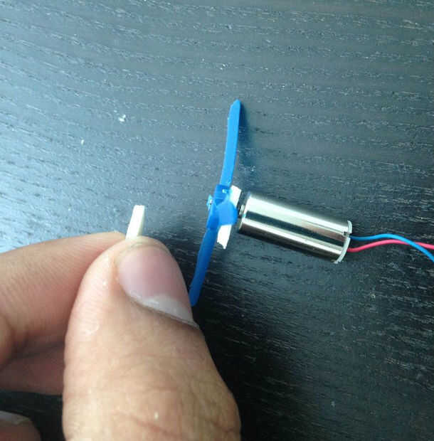 Con pegamento caliente, asegure la hélice al motor como se muestra en la foto de arriba.