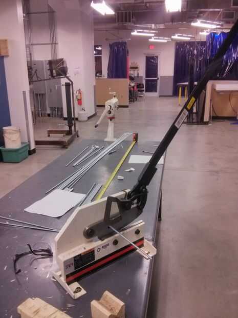 Esto valió la pena el precio de la entrada a TechShop aquí. He construir este tipo de estante y escritorio muchas veces antes, y la parte más difícil en gran medida ha sido cortar la varilla roscada. O toma para siempre o me corte los dedos en el proceso... o ambas cosas.