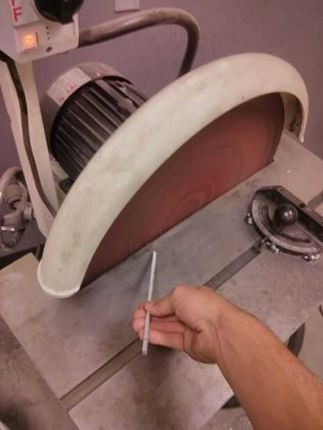 Esta vez, consiguió cortar la varilla usando un cortador de metal de hoja, luego usa una esmeriladora de disco para redondear los extremos. Mucho más fácil! Si no tienes acceso a estas herramientas, puede utilizar una sierra para metales o una amoladora para cortar la varilla y redondear los extremos - sólo tarda un rato.