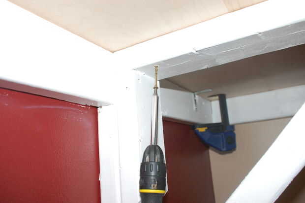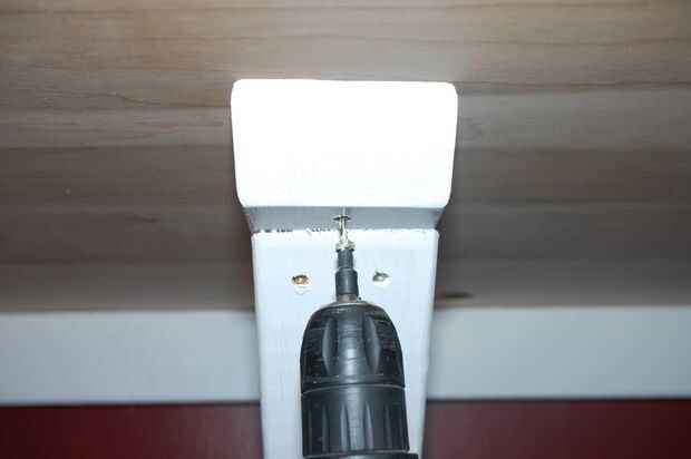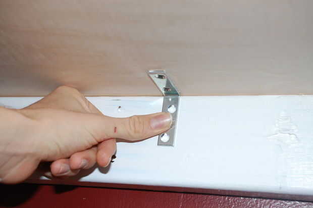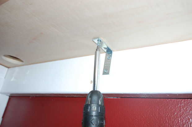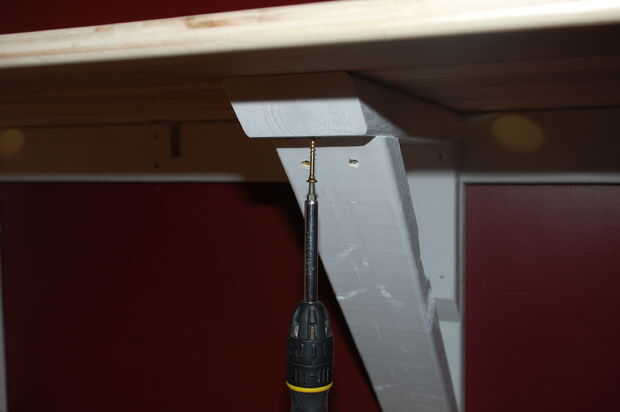Una vez los soportes en L, unidad 2" tornillos a través de la viga de apoyo del voladizo en la mesa superior. Una vez más, es probablemente una buena idea que haga estos agujeros con una broca de avellanar. Utilicé dos tornillos por viga de apoyo; uno cerca del borde exterior de la mesa y el otro cerca de la pared.