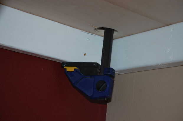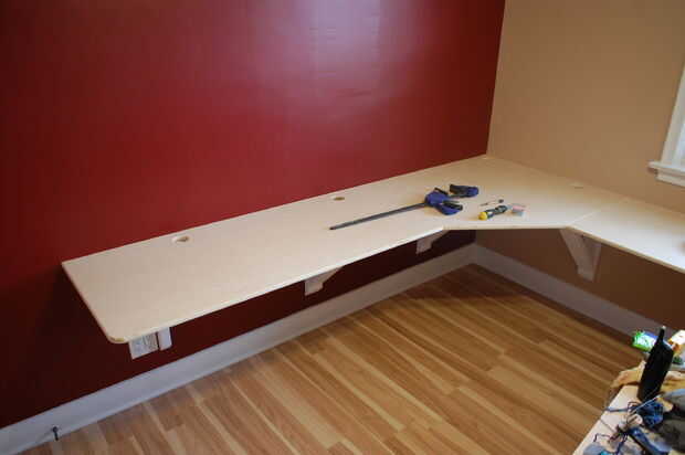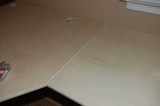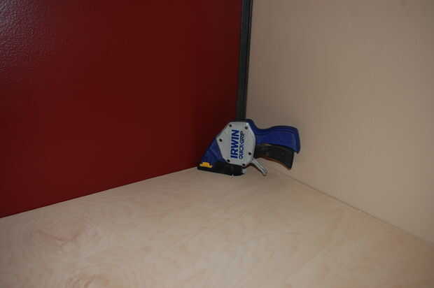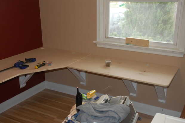 Arrastre de las grandes piezas de madera contrachapada y dry-fit para asegurarse de que todo alinea OK. Si tu escritorio está en múltiples piezas, coloque primero la pieza más grande. Alinee al ras contra la pared. Si es posible, fijarlo con la abrazadera hacia abajo para evitar desplazamiento mientras trabaja (o tortazo inevitablemente la cabeza como gateando por debajo).
