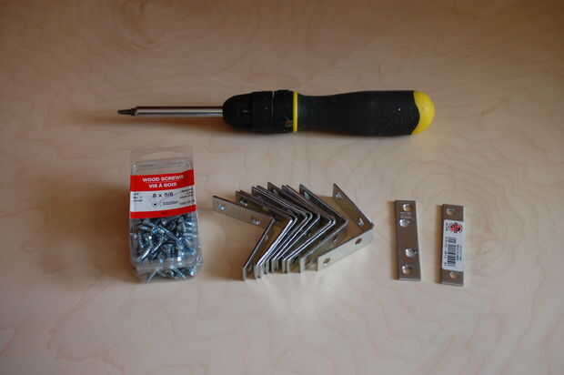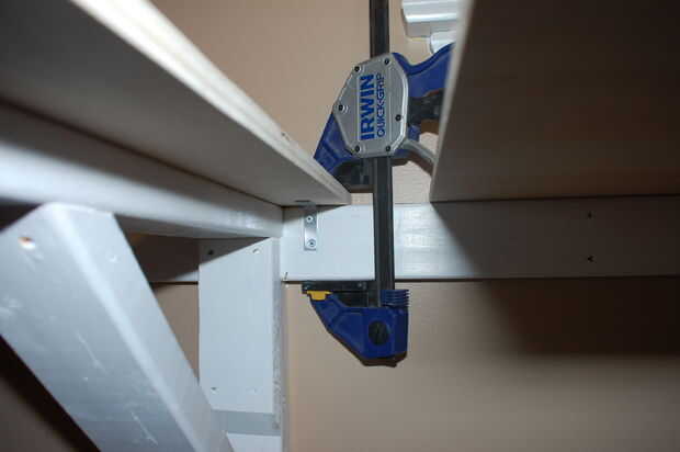 El escritorio en forma de L que construí fue hecho en dos piezas. Desafortunadamente las dos piezas estaban fuera de la alineación vertical por sobre un cuarto de pulgada. Después de instalar las dos piezas en sus vigas de apoyo individual, yo con abrazadera juntos para llevarlos a la alineación. Luego la atornillar un par de abrazaderas de soporte plano para permanentemente mantener las piezas Unidas.