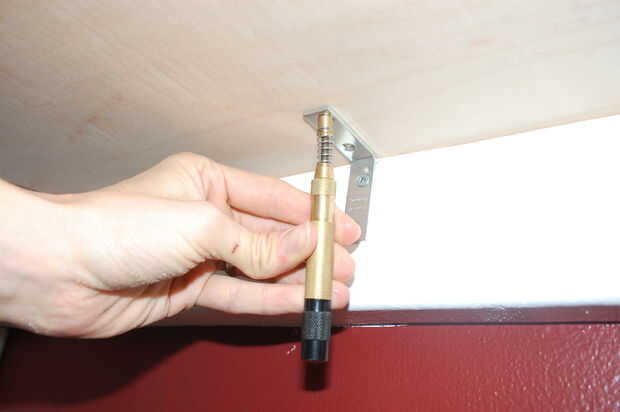 Consejo: Si tienes pinzas cuyas mandíbulas pueden eliminarse, puede ejecutar la barra a través de un orificio de acceso del cable y vuelva a colocar la mordaza en el otro lado de la superficie del escritorio. A continuación, sujete la mesa a la viga de apoyo!Los soportes en L se utilizan para fijar la mesa a la viga de soporte horizontal. Yo les espaciadas entre los apoyos de voladizo. Iniciar en el medio y obra exterior; primero fijar el soporte a la viga de soporte y luego a la mesa. Puede que desee utilizar un punzón para marcar los agujeros y darle el tornillo un bonito agujero en.