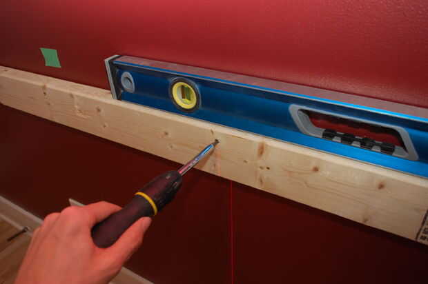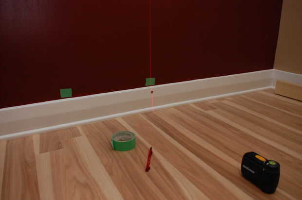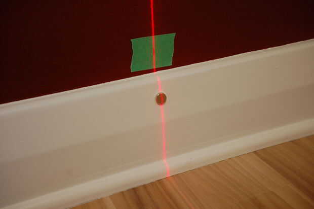 Tenía que ser un poco sneakier, sin embargo. En mi casa muchas de las paredes son placas de yeso con yeso y torno de metal! Como imaginar, el studfinder y el imán no pueden hacer cabezas o colas de donde los montantes son! El studfinder simplemente emite un pitido al azar o es incapaz de calibrar, y el imán no se pega realmente a nada. Aquí es donde viene la parte difícil en - los zócalos. Carpinteros de la vieja escuela casi siempre logrados los zócalos grandes y gruesos de uñas directamente en los montantes. Simplemente encontró los clavos con un imán y utiliza mi nivel láser para indicar el centro del montante.