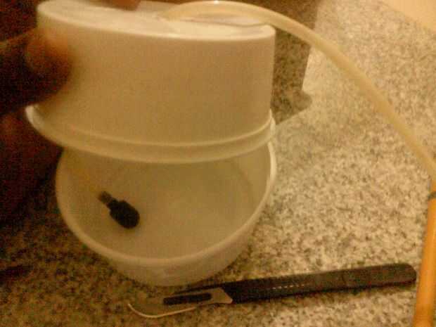 ahora todo lo que tienes que hacer es conectar una piedra de aire, ponga el medio biológico recomendado: en y sellar el contenedor. Utilicé tornillos no corrosivo. Simplemente conectarse la tubería de ail en la bomba y listo