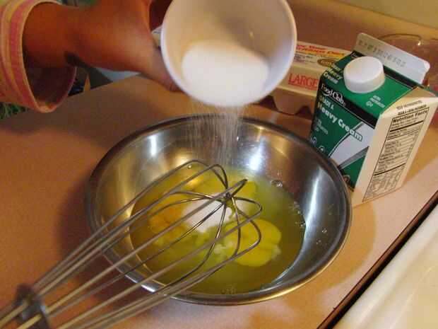 Crack los 3 huevos en el bol y batir hasta que quede bien mezclado. Batir el azúcar después.