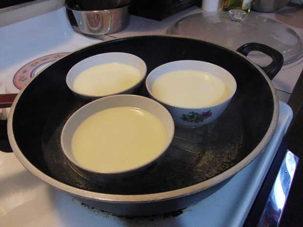 Vierta la mezcla de huevo encima de la cubierta de azúcar caramelizada la olla y encienda el calor alto. Una vez que hierva el agua en la olla, baje el calor al punto bajo. El tiempo de cocción total debe ser unos 50 minutos. Tenga cuidado al quitar los tazones de fuente, una vez hecho el flan. Pase un cuchillo alrededor del interior perímetro del tazón de fuente y tirón sobre una placa. Decorar, cortar y servir!