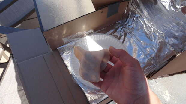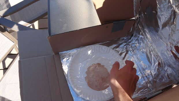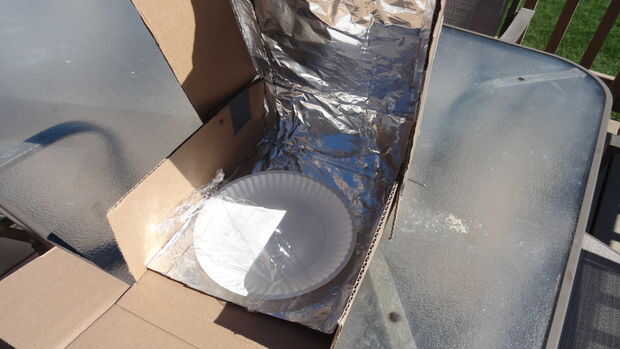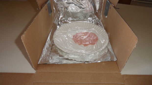 Lugar ahora el papel de la placa en el centro de la parte inferior la mitad de la caja. Entonces puede poner su comida en el plato, poner una tapa encima y ponlo en el sol para cocinar. Asegúrese de comprobar si está cocido o no cuando están haciendo esto. Si el alimento no está totalmente cocido, puede llevar a la enfermedad. Esto puede ser un problema de salud que usted necesita para tener en cuenta. Aunque esto puede ser un problema, trate de usar cosas precocinadas como perros calientes y otras cosas que son seguros para comer incluso cuando están fríos. Esto está muy bien, pero esto no es todo!