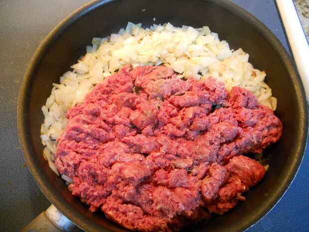 Añadir una libra de carne molida a la cebolla. Cocine hasta que la carne se dore.