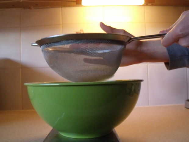 Sólo cernir las 3/4 de taza o 120g de azúcar glas en un recipiente de tamaño mediano.