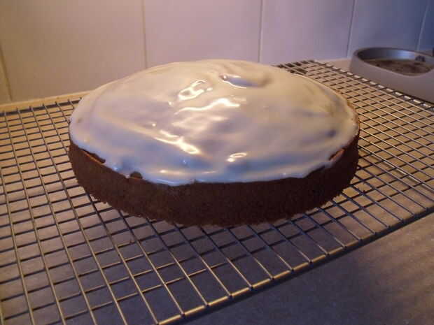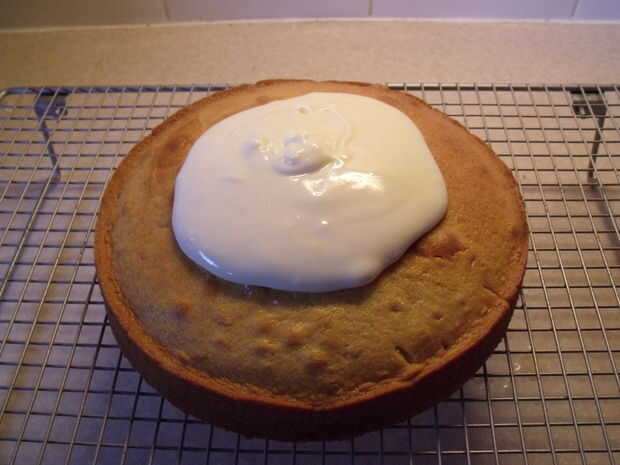Su solamente una capa delgada de la guinda de este pastel para que no se ve como suficiente para cubrir la parte superior de la torta.