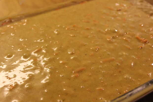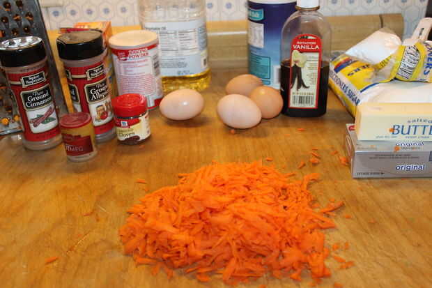 3. Añadir la harina, polvo de hornear, bicarbonato de sodio, sal, canela, pimienta, nuez moscada, clavo de olor molido y zanahorias ralladas.