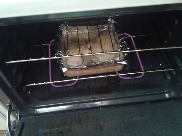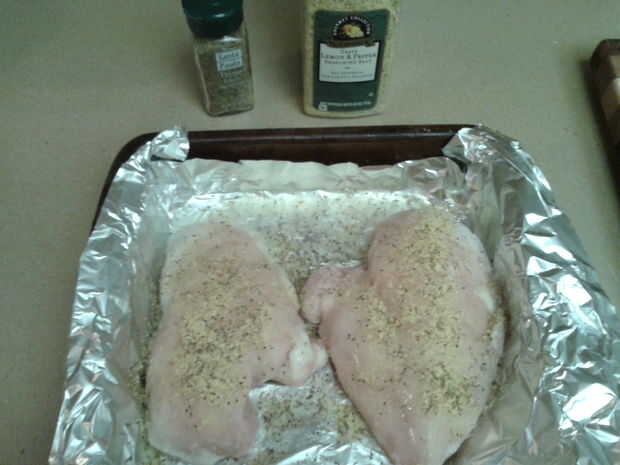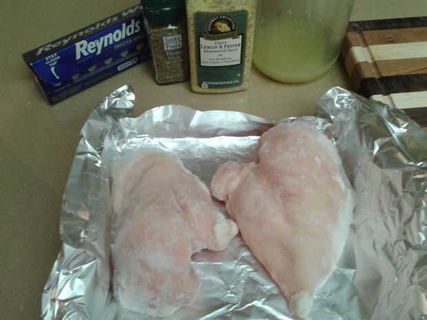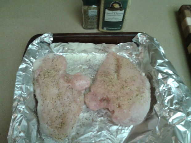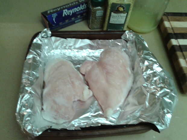 -Sacar todos los ingredientes (obviamente), precalentar el horno a 450 grados y coloque el pollo en una sartén que está rodeada por el papel.