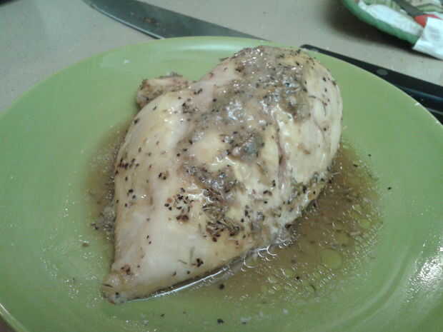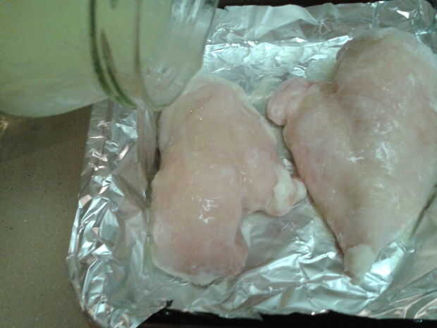 -Tomar el jugo de limón y verter una parte en la parte superior de la pechuga de pollo.