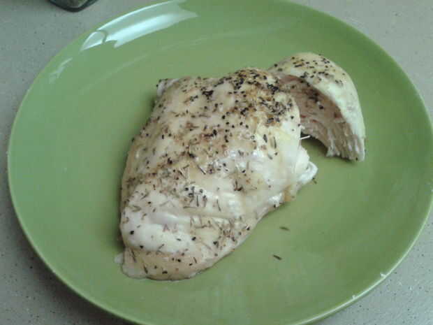 -Dé vuelta el pollo y moderadamente cubrir la parte inferior de la mama con la pimienta de limón y el condimento tomillo. Repetición que cubre la parte superior del pecho con ambos condimentos.