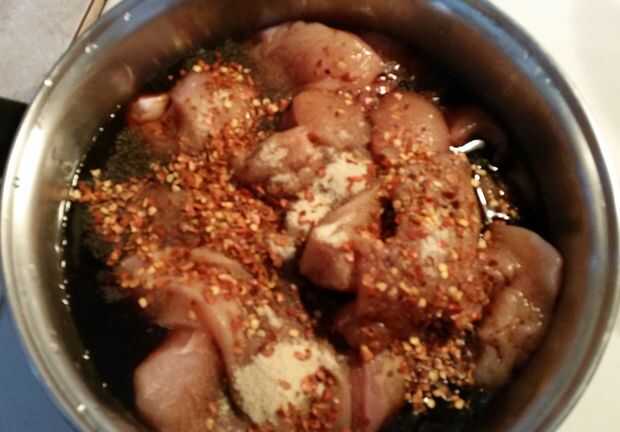 Añadir salsa de soja, 1C o menos dependiendo del tamaño de su bandeja, no lo suficiente como para sumergir pero lo suficiente para entrar en contacto todas las piezas y partes de pollo. (si enjuaga el pollo en el fregadero debe haber un poco de agua residual en la sartén y esto está bien. Si usted le dio unas palmaditas el pollo seco puedes añadir un poco de agua en una 4:1 ración de salsa de soja: agua), hojuelas de 3/4 cucharadas Ajo y una 1 guindilla de TBS.