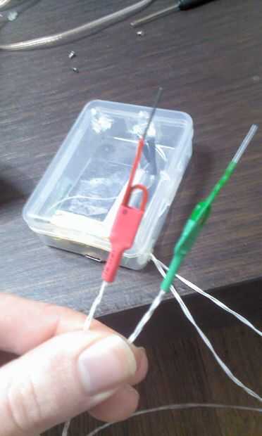 Luego soldar un clip de papel a cada uno de los cables trenzados, usé rojo para + y verde para-. Me deslicé correspondiente envoltorio sobre la espalda de ellos para cubrir la fealdad de mi trabajo de soldadura.