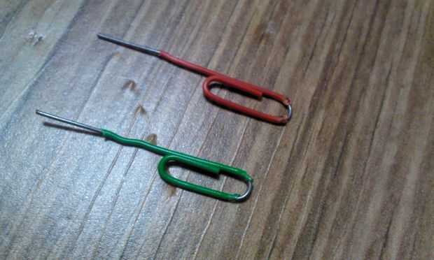 Seleccioné los clips de papel de colores (que sucedió también con envoltorio tenía) y ellos así un lado pegado hacia fuera. Utilicé el cortador de la caja para eliminar el recubrimiento de plástico en las puntas y puntuación de la parte posterior (donde se suelde los alambres trenzados). Usé el mechero para calentar el plástico donde había anotado lo de la capa y el plástico tirado lejos revelando el metal por debajo.
