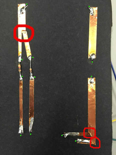 Usando la cinta conductora, crear un circuito de 3'' x 4'' pedazos de espuma. Si la cinta debe ser doblado (como se ve en los círculos rojos) Asegúrese de doblar mientras se mantiene unido. Si se corta y simplemente puesto encima de otra pieza, el pegamento inhibe la conductividad.