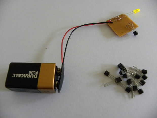 En primer lugar es útil para saber cómo funciona un transistor. En realidad, un transistor es simplemente nada más que un minúsculo interruptor que no controlar con el dedo, pero con una señal electrónica. Hay 3 pines de un transistor. Un colector, una Base y un emisor. Si pones una señal electrónica en la Base, el interruptor está abierto y electricidad puede fluir por el emisor y el colector. En este instructable os muestro cómo hacer un probador de transistor que le muestra si los 3 pernos todavía están trabajando, y si no tienen un defecto.
