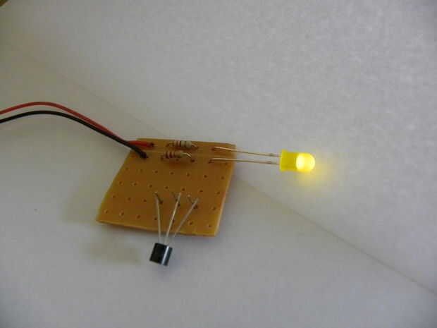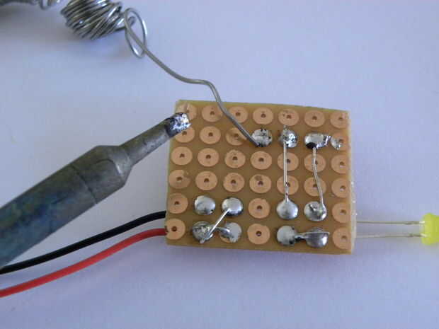 Hacer el esquema y soldar todo junto. Tomar 3 piezas de alambre que palillo hacia fuera de la placa, donde pones el transistor conduce a él.