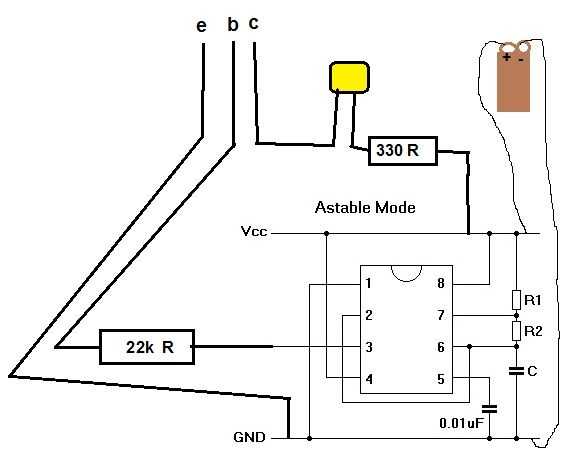 Si quieres hacerla más avanzada, pongo otro esquema en la selección de fotos. Aquí el temporizador NE555 enciende la Base y, por lo que estás seguro de que realmente funciona. Esto es un poco más pesado para hacer, porque también necesita unas cuantas más resistencias y un condensador y un buen prototipo board. En mi tablero de prototipo que los agujeros están a muy lejos de uno al otro, así que un chip no cabe en él. También puede utilizar un protoboard para esto. Dependiendo de las resistencias y condensadores que utilizas, puedes chanche la frecuencia de la conmutación de la Base.