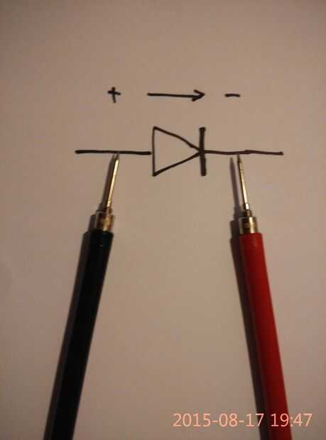 Diodos son un tipo de semiconductor, por su medio, la corriente puede pasar un único sentido. El símbolo de diodo narra, corriente puede pasar a través de forma positiva al lado negativo que tiene la barra vertical en el diodo. Para el metro de estilo japonés tradicional, el cable negro es la polaridad positiva de la batería interna en la gama óhmica. Tal conexión llamado al avance parcial, la resistencia medida sólo varios ohmios en gama Rx1, pero no cero, mientras que la medición inversa da no leerán.