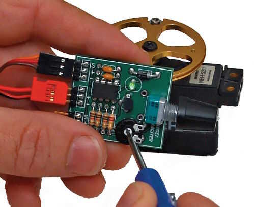 Con un destornillador pequeño, ajuste el bote ajuste hasta que el servo quede centrado. He encontrado que 1/8 a 1/4 de vuelta hacia la derecha es necesario para el servo del centro.