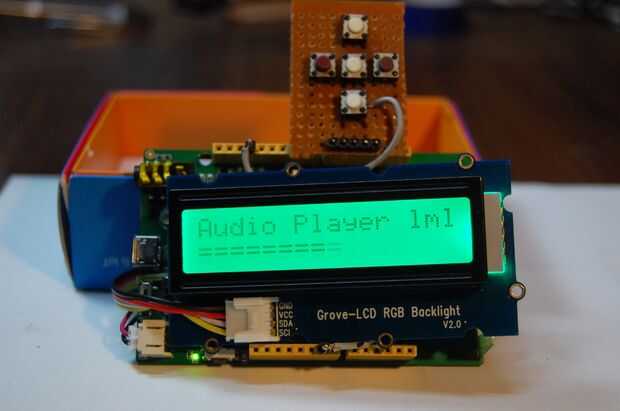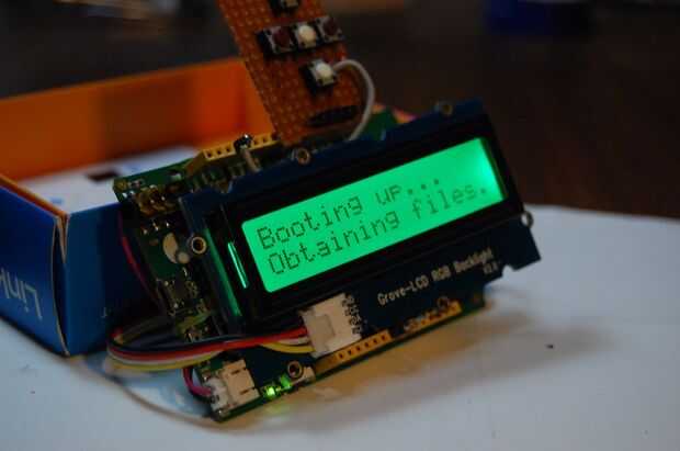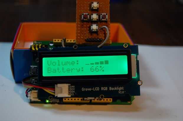 No sé si me habría sorprendido, pero la calidad del audio por el LinkIt es muy muy buena! La pantalla muestra periódicamente el porcentaje de batería y nivel de volumen (porque la pantalla es demasiado pequeña para mostrar todo a la vez).