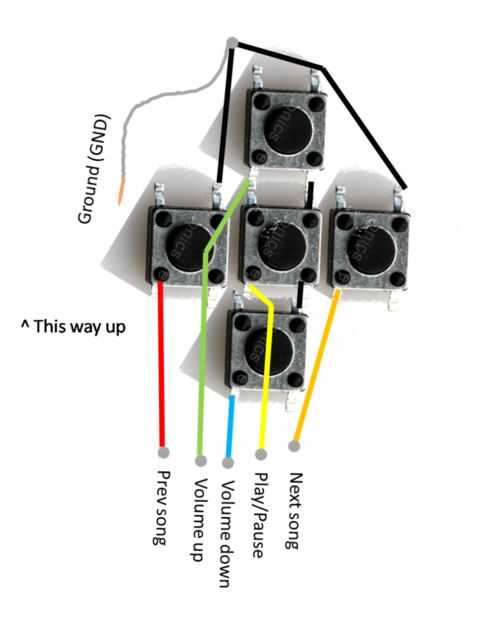 Hay 5 botones en total, cada uno para reproducir/pausa, canción siguiente, canción anterior, subir volumen y volumen abajo. El diagrama de arriba muestra la disposición de los botones en la placa junto con las conexiones. No dude en cambiar las configuraciones de pin (aunque Recuerde que debe modificar el código en consecuencia); Aquí están mis conexiones: