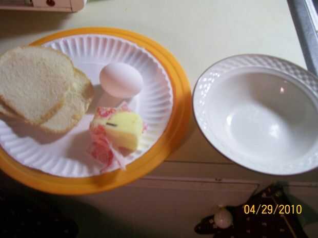 este es un desayuno muy fácil si estás en el camino.Paso 1: Pan y huevos Rociar aceite de oliva/mantequilla en su pan, romper 2 huevos en un bol y mezclarlos.(agregar el condimento en este momento si desea)Paso 2: Cocinar y la formación de huevos Vie